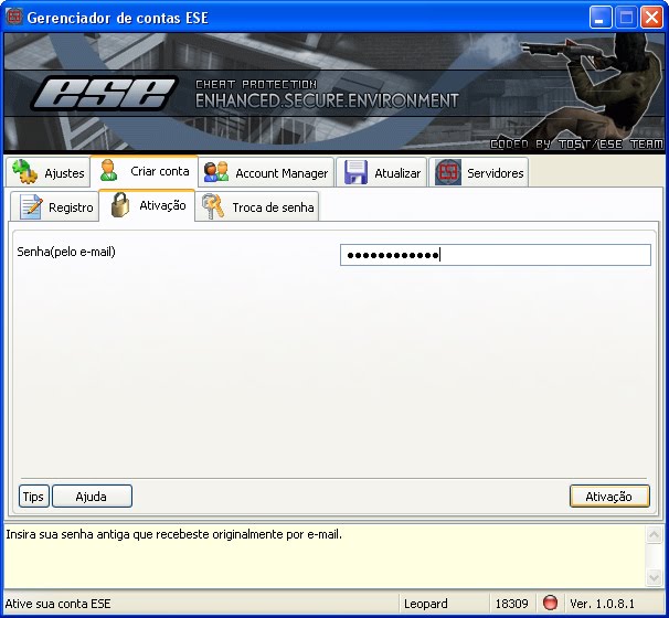 Cole a senha no campo indicado e clique em Ativação.