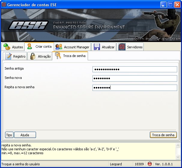 Veja no rodapé da imagem os caracteres permitidos quanto à troca de senha.