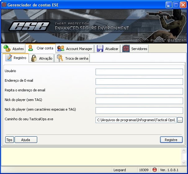 Na aba "Registro" preencha corretamente seus dados, selecione o caminho de instalação do TO e clique em Registre.